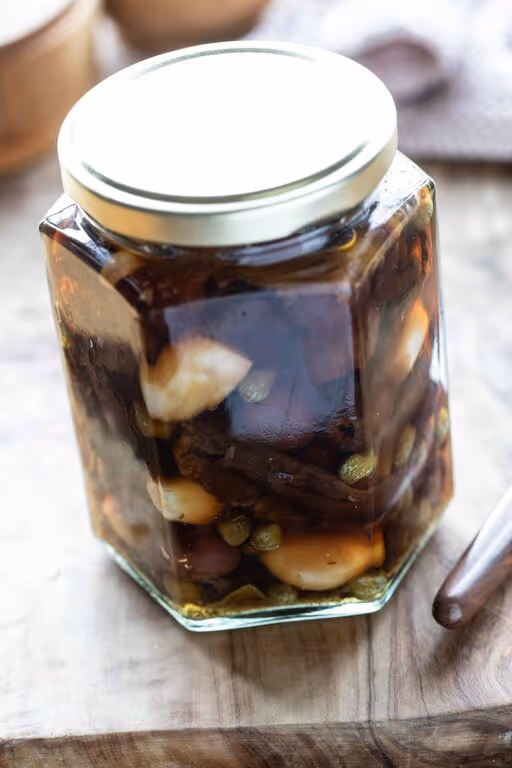 Fordel ligeledes hvidløg, krydderurter, kapers og oliven i de to sylteglas.
